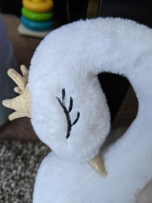 [This review was collected as part of a promotion.] This swan is so adorable, it’s very soft. The wings have longer fur stuff on them so they look more realistic with cute tulle on the outer edges for accent. The crown and beak are both a glittery gold fabric. It’s down very well, nothing feels like it’s going to come loose or get any holes in it anywhere. Perfect for a baby to touch and feel and safely chew on without worry