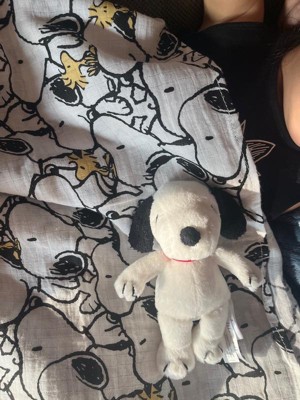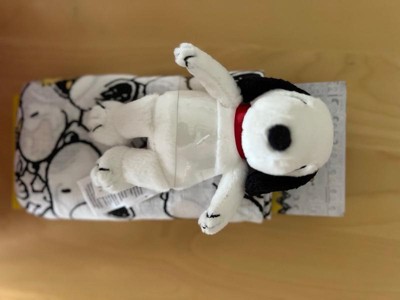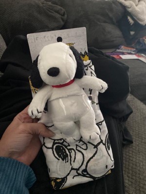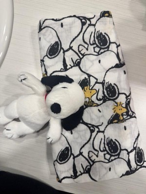 Introducing the ultimate comfort combo for your little adventurer. This adorable duo combines the soothing power of a soft, breathable 100% cotton muslin swaddle blanket along with a mini sized plush Snoopy stuffed animal. The blanket is perfectly sized at 44” X 44” and features our favorite canine Snoopy with his sidekick Woodstock. The set also includes a small Snoopy plush. He is approximately 6 ½ inches tall and sits 5 inches tall and is made in a soft white minky. His floppy ears, nose and body spot on his back are made of black fleece. His expertly embroidered face makes him baby safe and a small red ribbon (collar) completes this adorable gift set.