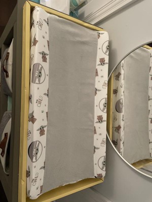 [This review was collected as part of a promotion.] So cute! We absolutely love Star Wars and The Child so we were so happy to see this changing pad cover. Not only is it completely adorable, but the middle is minky soft and a little thicker than the rest providing more cushion for the baby when getting changed. It fits our contoured changing pad easily and has the strap holes. Also, it is machine washable for easy cleaning.