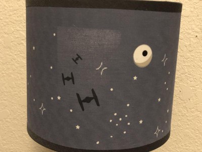 - Lamp shade is a dusty blue with white stars, three tie fighters and the Death Star
