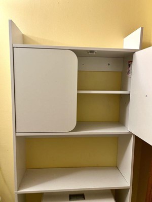 My bathroom doesn’t have much storage options, so having this over the toilet bathroom cabinet has been a great addition. It was fairly easy to put together, and I appreciated on how detailed the instructions were. On the top there’s an open shelf, which is a great location for extra toilet paper. Then there are two cabinet doors with an adjustable shelf inside. This has been a great storage location for toiletries. There’s also another open shelf underneath.