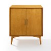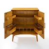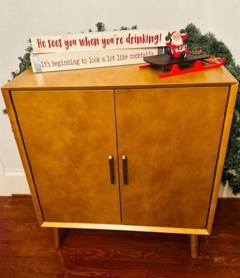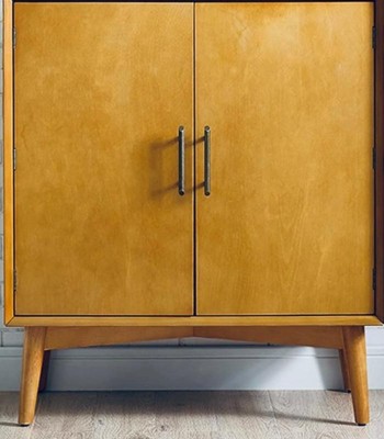 Shake up a drink and showcase mid-century modern style with the Landon Bar Cabinet. Featuring a sleek profile and classic tapered legs, this cabinet offers maximum storage space in a compact frame. Both doors feature fixed shelves designed to hold large bottles and glasses. Inside the cabinet, you'll find seven wine cubbies, an adjustable shelf, and slots for hanging stemware. Keep your spirits close at hand but out of sight with the Landon Bar Cabinet. OVERALL PRODUCT DIMENSIONS: 31.75”W X 19”D X 36”H
