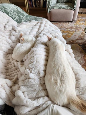 It's so soft, maybe even softer than the cats' fur? Warm, silky soft, can't stop touching it. It's beautiful and hides the cat fur too!
