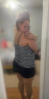 Finally a tankini top that is long enough, does not ride up, and provides good support. The pattern is pretty and goes well with the navy swim shorts as well as the matching shorts.