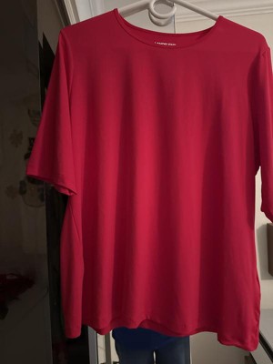 I have been waiting for a true red, bordering on a blue-red. This is a beautiful top. I wear these short sleeve tops all spring and summer and purchase new ones each year. I love it.