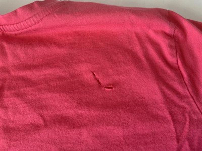 Followed the machine washing instructions and after taking it out of the dryer, there were 3 holes on the back of the shirt. Never wore the shirt. Very poor quality material.