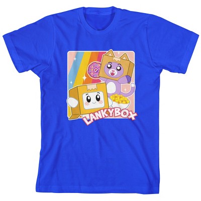 - Custom Design: Celebrate Lanky Box with this eye-catching t-shirt featuring Boxy, Foxy, Rocky, and Thicc Shark on a bold blue and white striped background. The bright yellow logo letters enhance the dynamic look, making it a fun choice for fans.