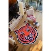 A: The rug features a vibrant tiger head design with fierce orange tones and playful pink and purple accents.
