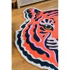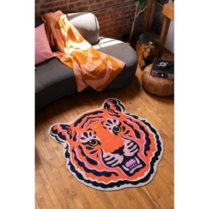 Add a bold statement to your space with the Jessica Miller Funky Statement Tiger Rug. This eye-catching rug features a vibrant tiger head design, blending fierce orange tones with playful pink and purple accents. Crafted from 100% polyester, it offers a soft, cloud-like feel underfoot while being durable and easy to maintain. Its 6' x 6' irregular shape adds a dynamic touch to living rooms, bedrooms, or any area needing a burst of personality. Plus, it√¢is pet-friendly, low-maintenance, and non-slip for added convenience.