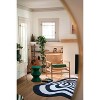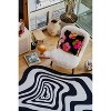 A: The rug showcases an op-art-inspired design with abstract black and white geometric shapes.