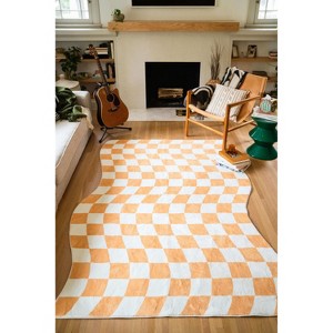 Elevate your space with this geometric and abstract mustard checkered rug, featuring a timeless yellow checkered pattern. The intricate arrangement of checkered and wavy shapes adds visual interest and sophistication to any room. An ideal choice for those seeking a versatile and practical addition to home decor.