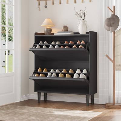 Large 6-Tier Shoe Organizer with 3 Doors & Hooks - Black Entryway, Hallway or Living Room Shoe Cabinet