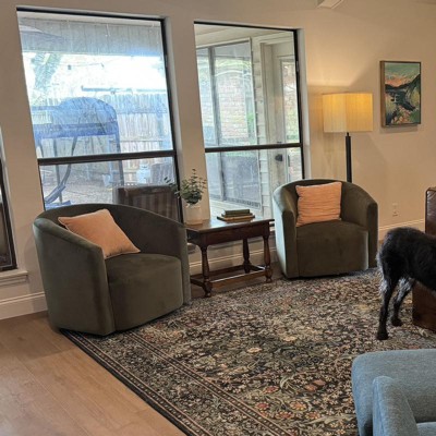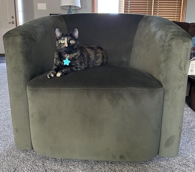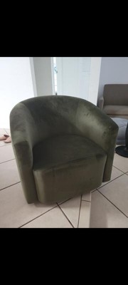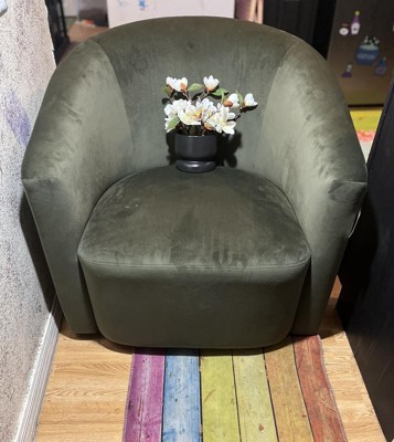 Create a comfy seating spot in your bedroom or living room with this Large Aveline Swivel Chair from Threshold™. This fully upholstered swivel chair designed with a barrel shape features a padded seat and a curved back with armrests to provide you a comfortable seating experience. The solid velvet upholstery blends seamlessly with a range of decor styles, while the swivel mechanism helps it turn in any direction for versatile use.