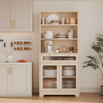 - Elegant Showcase: The glass door sideboard buffet cabinet showcases dinnerware and decor, adding elegance and openness to any room, while the wooden parts provide privacy for less frequently used items, keeping your space organized and tidy.