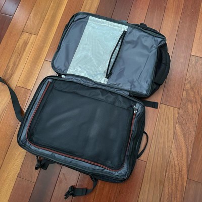 [This review was collected as part of a promotion.] I purchased this travel backpack for my husband for Christmas. He was looking for something he could take on today business trips without having to lug a whole suitcase and this works great. It has a pouch in the way back for your laptop. The middle section unzips like a suitcase. it has an expandable zipper to make it a little larger if needed. It also has a toiletries zipper inside that is seemingly water tight overall a great basic backpack for short travel trips.