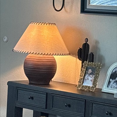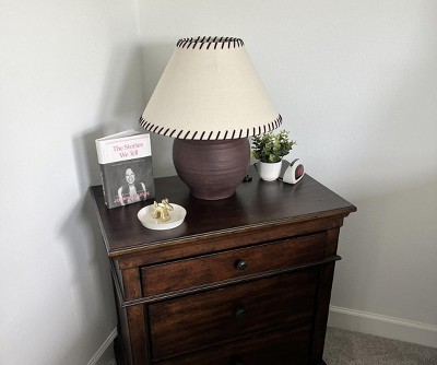 Add a fantastic style to your home decor by lighting the space with the Large Earthy Table Lamp with Whipstitch Shade from Threshold™ designed with Studio McGee. This large table lamp features a round, brown ceramic base that accompanies an empire-shape shade with whipstitch detailing for a gorgeous look. Designed with a socket turn knob rotary switch, this table lamp has a one-way on-and-off light setting.