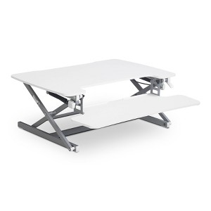 The modern work from home professional knows that a standing desk converter is the secret weapon to staying productive and comfortable while working. Energize your work life with an ergonomically designed stand up desk converter, taking your work setup from sitting to standing in moments. The dual gas lift takes all of the work out of the conversion, with enough space to hold your monitor or laptop, along with a lower tray for your keyboard and mouse. Choose between black or white desktops to fit this convenient product smoothly into your home office decor. Say goodbye to neck and back pain with this innovative standing desk converter.