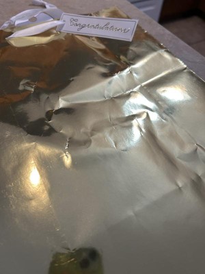 “I received these products for free from the Hey, Bullseye™ sampling program in exchange for my honest review.” The bag is sturdy and a great size for a sizable gift. It has a ribbon handle and an attached gift tag with Congratulations. What I didn't like was how quickly the foil looked crinkled and used. Most of the rough appearance was from the shipping process. This arrived via mail in a plastic mailing bag and took a beating in the process, so buy in store if you like this.