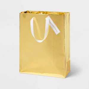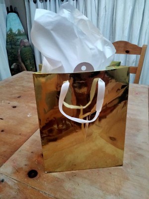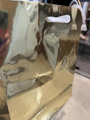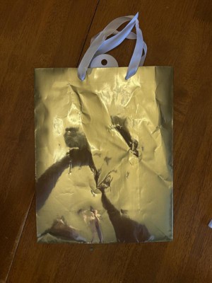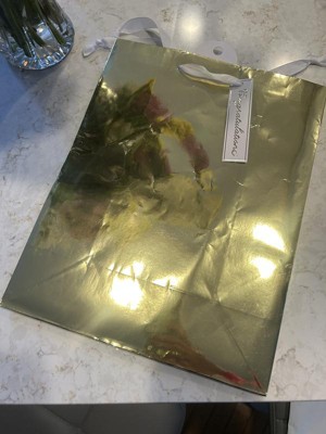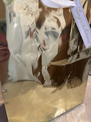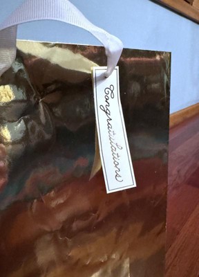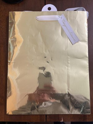 This Spritz gift bag is strong quality. It has nice ribbon for handle and a pretty congratulatory tag. It is a bwauitful gold reflective color, you can literally see yourself in this bag. It is nice to hold a small to medium size gift.