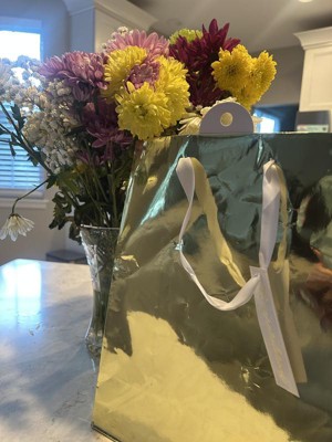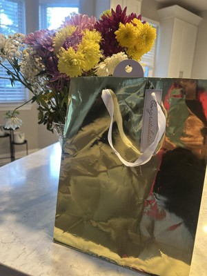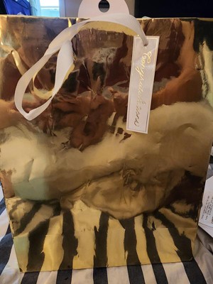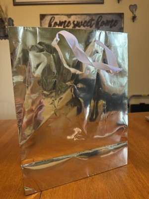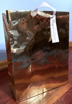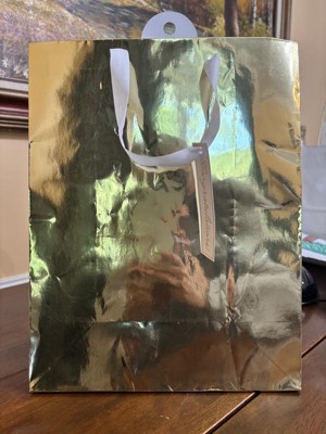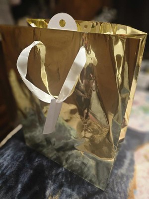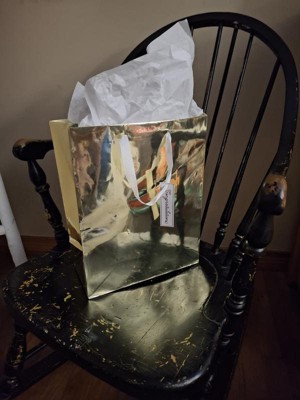 This is a really Beautiful gift bag. There is such a super high shine on this metallic gold colored bag. It had a very pretty ribbon handle detail with a gift tag attached. It is a spacious bag that measures 12 3/4 tall x 5" deep x 10" wide