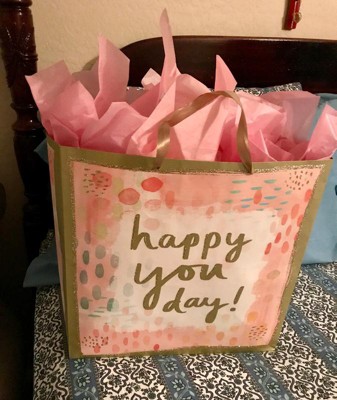 Add a little joy to someone's day when you give a gift in this fun Large "Happy You Day" Watercolor Gift Bag from Spritz™. From birthdays to baby showers to anniversaries, this large paper gift bag suits all your year-round gifting needs for any occasion. The gift bag features the phrase "Happy You Day" on a watercolor backdrop, while soft fabric handles on the top make for easy carrying. Just slide in some colorful tissue paper and personalize the tag for a perfect finishing touch.
