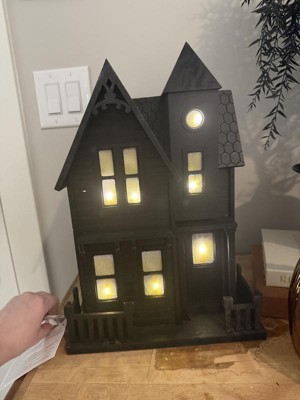 Add a creepy element of light to your tabletop with this Large Haunted House Figurine from Threshold™. This black haunted house figurine with cutout windows and a door features a light-up design to add extra excitement to your Halloween display. Suitable for indoor display, this battery-operated haunted house can be placed on the mantel, console or book shelf along with other spooky accents to decorate your space.