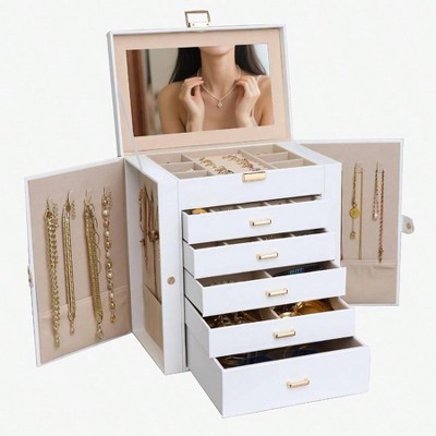 Large Lockable Leather Jewelry Box with Mirror, Huge Organizer Storage Case for Necklaces, Earrings, Rings, Bracelets
