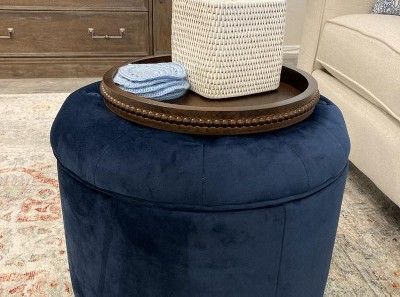 This Velvet Tufted Round Ottoman features a lift-off lid with all over button tufting for classic style. Upholstered in soft and durable velvet, this elegant round ottoman has wood legs in a rustic brown finish. Use as a storage ottoman to hide accessories in a bedroom, to store books or magazines in a living room, or to keep controllers or remotes nearby but out of sight. Pair two together for added impact. This tufted ottoman is available in a range of rich velvet colors with coordinating accent items in the same hue. Easy to assemble and maintain. Please note that fabric and wood colors may appear slightly different due to variations in lighting or screen settings.