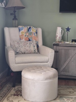 I love the color and style of this ottoman. The storage is also great! The only issue was that the screw was missing to screw one leg into. It was out of stock online, so instead of returning, I was able to put two screws in from the inside.