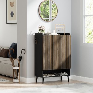 - Built-In Hooks for Keys & Bags:Two metal side hooks are included to conveniently hang keys, umbrellas, or bags, making this a multifunctional entryway shoe storage cabinet with hooks that helps keep your essentials organized and within reach