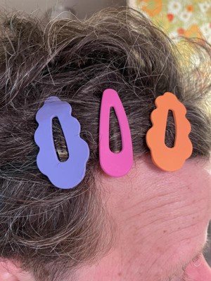 I got these 3 pairs of girls hair snap clips. Bright lovely colors that all girls will love. Large and soft to the touch. Easy to place and snap on the hair. They look and feel durable. They seem to hold hair in place. I recommend them.
