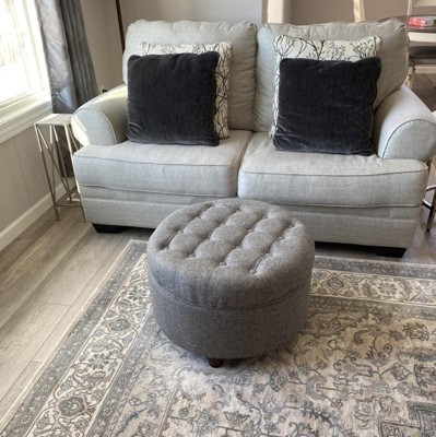 This large round storage ottoman offers a timeless style. Use it in a living room or family room to contain controllers, remotes or toys or place it in the bedroom to store extra pillows or blankets. One ottoman offers stylish seating and storage ─ two paired together doubles the impact wherever it's needed most. This round ottoman has a tufted lift-off lid for quick access to storage and tapered wood legs. Available in a range of neutral colors and fabrics; easy to assemble and maintain. Please note that fabric and wood colors may appear slightly different due to variations in lighting or screen settings.