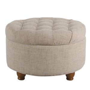 This large round storage ottoman offers a timeless style. Use it in a living room or family room to contain controllers, remotes or toys or place it in the bedroom to store extra pillows or blankets. One ottoman offers stylish seating and storage ─ two paired together doubles the impact wherever it's needed most. This round ottoman has a tufted lift-off lid for quick access to storage and tapered wood legs. Available in a range of neutral colors and fabrics; easy to assemble and maintain. Please note that fabric and wood colors may appear slightly different due to variations in lighting or screen settings.