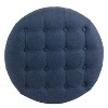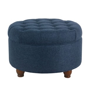 This large round storage ottoman offers a timeless style. Use it in a living room or family room to contain controllers, remotes or toys or place it in the bedroom to store extra pillows or blankets. One ottoman offers stylish seating and storage ─ two paired together doubles the impact wherever it's needed most. This round ottoman has a tufted lift-off lid for quick access to storage and tapered wood legs. Available in a range of neutral colors and fabrics; easy to assemble and maintain. Please note that fabric and wood colors may appear slightly different due to variations in lighting or screen settings.