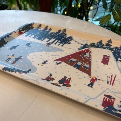 I passed by this tray and couldn’t pass up this ideal winter snow/ski lodge scene. Love the vintage illustration style & colors + the size of the tray. I will use this when I go to holiday parties & for my friends annual cookie exchange. At this price, it would be a really nice gift to leave behind if your friend likes the same style. I double checked that it is ok to put food on this melamine tray.