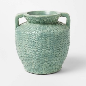 Accent any room with the elegant charm of this Large Woven-Texture Ceramic Vase from Threshold™ designed with Studio McGee. Designed in an amphora shape, this vase features a basket-weave texture that adds depth and dimension to your space. The blue color brings a soft touch, while the dual handles make it easier to carry. Plus, the watertight construction allows you to fill it with fresh stems if desired.