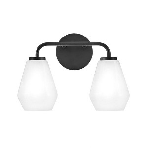Subtle geometric elements find harmony within the sleek, curved lines of Gio. The cased opal glass covers the space in functional, diffused light while providing a nice contrast to the bold variety of finish colors. Gio’s transitional glam design and clean profile add to any bath décor. Material: Steel, Finish Color: Black, Width: 14.75", Height: 10.25", Length: 7.25", Depth: 7.25", Height From Outlet Box: 2.5", Backplate Width: 5", Backplate Length: 5", Lamping Type: LED, Number Of Bulbs: 2, Wattage: 10 Watts, Dimmable: Yes, Moisture Rating: Damp Rated