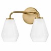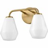 Subtle geometric elements find harmony within the sleek, curved lines of Gio. The cased opal glass covers the space in functional, diffused light while providing a nice contrast to the bold variety of finish colors. Gio’s transitional glam design and clean profile add to any bath décor. Material: Steel, Finish Color: Lacquered Brass, Width: 14.75", Height: 10.25", Length: 7.25", Depth: 7.25", Height From Outlet Box: 2.5", Backplate Width: 5", Backplate Length: 5", Lamping Type: LED, Number Of Bulbs: 2, Wattage: 10 Watts, Dimmable: Yes, Moisture Rating: Damp Rated