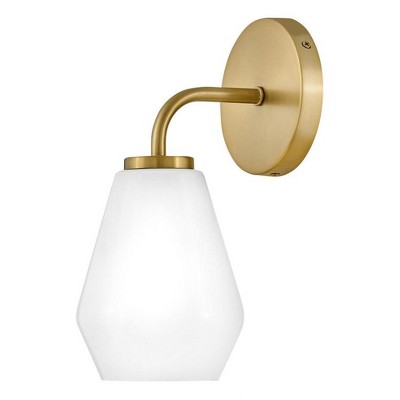 Haddie is the star of the show. The sturdy structure is rounded out with curved cased opal glass for a unique, shapely profile. Striking in any of the fun finish colors, Haddie brings substantial style whether you choose to mount the light up or down. Material: Steel, Finish Color: Lacquered Brass, Width: 5.25", Height: 9", Length: 7.25", Depth: 7.25", Height From Outlet Box: 2.75", Backplate Width: 5.25", Backplate Length: 5.25", Lamping Type: LED, Number Of Bulbs: 1, Wattage: 10 Watts, Dimmable: Yes, Moisture Rating: Damp Rated