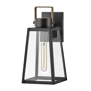 Hype up your alfresco area with the Hugh outdoor lantern and its sleek transitional style. The trapezoidal design features bold over scaled clear glass panes framed by carefully curated two-tone metal finish options to inject a modern edge. Choose from classic Antique Brushed Aluminum with a matte Black accent or a rich Black with a warm Burnished Bronze accent. Pro tip: we recommend a tubular vintage filament bulb to make Hugh pop on porches, patios or amp up any exterior space.