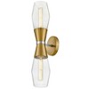 A geometric gem, Livie cleverly mixes sleek lines with an angular shape for a contemporary cool look that makes itself at home anywhere. Clear glass unites with spun metal elements in striking Black or luxe Lacquered Brass finish options to boldly underscore Livie’s modern edge. Material: Steel, Finish Color: Lacquered Brass, Width: 5", Height: 22", Length: 6.25", Depth: 6.25", Height From Outlet Box: 11", Backplate Width: 5", Backplate Length: 5", Lamping Type: LED, Number Of Bulbs: 2, Wattage: 10 Watts, Dimmable: Yes, Moisture Rating: Damp Rated