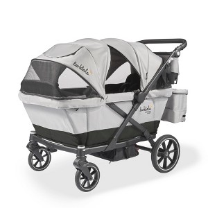 The Larktale caravan coupe Quad offers all the features of a large stroller/wagon, in a more nimble and compact package with an impressively small fold, all while maintaining the comfortable seating and higher weight capacity you crave for your growing kiddos. Suitable for children from 6 months to 48.5 lbs per seat, the caravan coupe will comfortably seat up to four growing kids with reclining seat backs and a shared drop-down footwell for comfortable stroller-style seating. The unique no rethread harness system can be reconfigured to seat either one or two passengers per side and the roomy interior can safely accommodate a newborn using a caravan quad car seat adapter (sold separately). If you need space to haul cargo or let your little ones stretch their legs, you can securely invert the footwell to create a flat base interior to suit your needs. No tools are needed to complete the transition, making it easy for parents to change their strolling style on the fly. Parents will also love the dual adjustable sun canopies with air-flow panel and peek-a-boo window, seat recline, height-adjustable leatherette handlebar, included stroller organizer and self-leveling cup holder, and the all-wheel suspension system. The impressively compact fold of the caravan™ coupe Quad is a game changer for multi-kid families that need a stroller/wagon but are short on vehicle trunk space, or storage space in their homes.