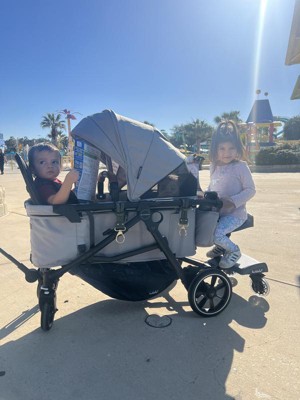 We received the rider board in exchange for an honest review therefore i would like to share that this is what my 5 year old has been asking for. Not only is it comfortable for her but its also comfortable for myself. I found myself kicking other rider boards but this has a nice space in between the two wheels which allows me to push and have space to walk without feeling like im going to run into the board itself. The features is another amazing thing. Seat can come off to make it a stand on board with just clicking one button. The seat has a cushion and small grab handle that allows your rider to feel confident. The board also comes w a strap that clips onto the stroller / wagon handlebar to allow it to put the board up when not in use. Lastly, the installation is by far the quickest and easiest. We love that we can use this board w all of our strollers and wagons.