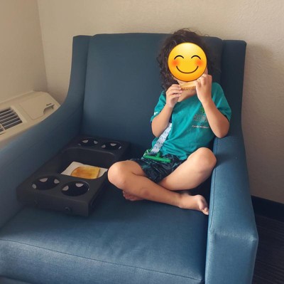 I purchased this snack tray after it was shared in a Mom group. Best decision it is by far the Best snack tray available. It is very sturdy, has 4 placements for cups, it attaches easy, you can place the iPad in the middle , or you can place toys, food ect I’m so happy with it.
