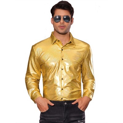 • Metallic design, plaid pattern, color block collar, shiny button down disco shirts