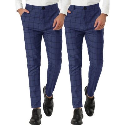 Lars Amadeus Men's Plaid Printed Slim Fit Flat Front Business Dress Pants 2 Packs Navy Blue/White 36