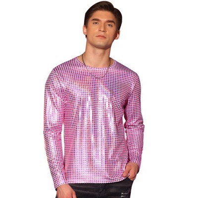 INSPIRE CHIC Men's Round Neck Long Sleeves Shining Disco Metallic T-Shirt