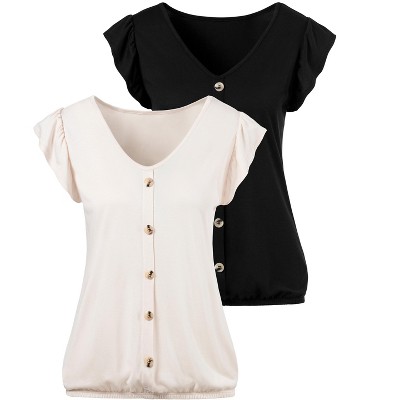 Go for a fun and flirty look with this pack of two stylish V-neck tops. * Butterfly sleeves * Decorative button panel * Elastic hem * Length approx 24.41 inches * 65% Polyester, 35% Viscose. Imported. * Machine wash cold with like colors, inside out * Hang to dry or lay flat