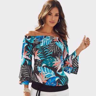This stylish blouse with trendy button details is perfect for any occasion. * V-neckline with two decorative buttons * Slightly rounded hem * Print may vary * Length approx. 24.4 inches * 100% Viscose. Sustainable viscose. Imported. * Machine washable