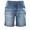 Distressed look shorts with a light wash effect. * Slightly longer style which is ideal for rolling up * Five-pocket style with belt loops * Zip and button fastener * Print may vary * Inside leg approx. 6.75 inches * Runs large * 98% Cotton, 2% Elastane. Imported. * Machine wash cold with like colors, inside out * Hang to dry or lay flat